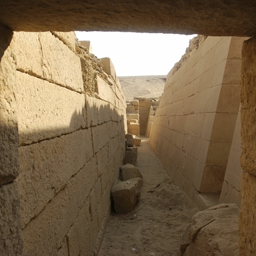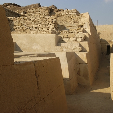 - La seconde est la présence à 1,75 m de la surface du parement, d’un mur interne sommaire mais qui a la même pente que la façade. Ce mode de construction comportant au moins deux structures emboîtées, la première étant un squelette intérieur et la seconde le parement extérieur évoque les strates inclinées de la construction « feuilletée » des pyramides de la IIIe dynastie.