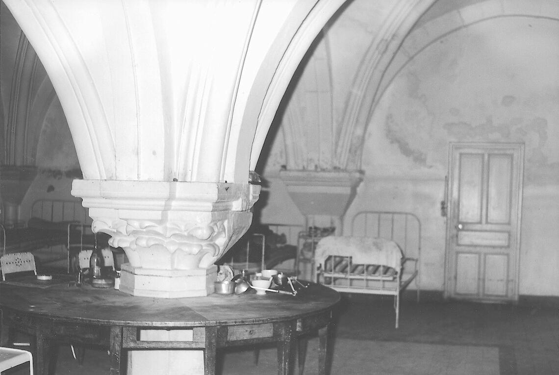 La sacristie, annexe de l'église où les clercs viennent déposer les objets de culte, est une salle rectangulaire séparée par deux piliers au centre. Cette photo, prise lorsque la sacristie sert d'hôpital durant le XIXe siècle, montre au premier plan l'un de ces deux piliers.