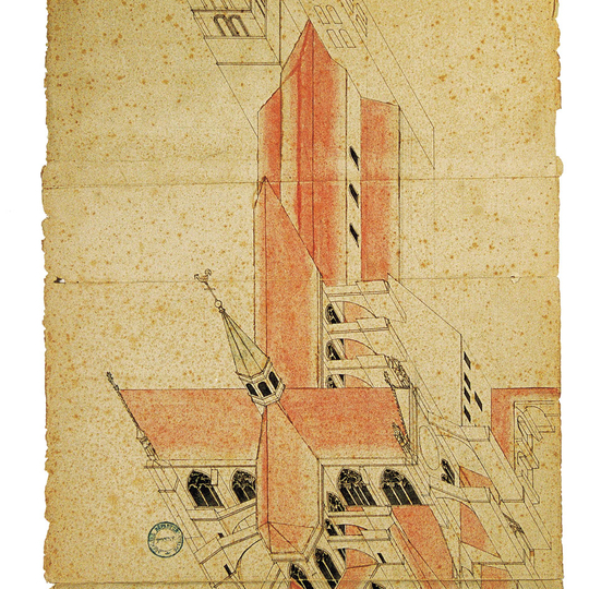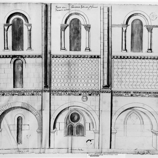 Avant-nef, élévation du mur extérieur sud par Dom Thivel vers 1725