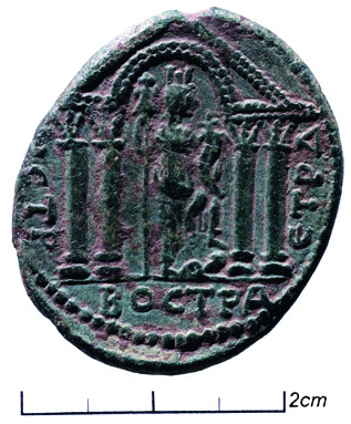 Revers : Monnaie de Septime Sévère, an 104 (209/10 ap. J.-C.). Tychè dans un temple, (Droit : Septime Sévère). Dans les importantes émissions de l’an 104, le revers de la pièce ornée du portrait de Septime Sévère met en scène la Tychè de Bosra dans la baie centrale d’une façade tétrastyle surmontée d’un fronton échancré en arc. Reconnaissable à sa couronne tourelée, Tychè porte ici une couronne d’abondance, au lieu du simple bouquet de trois épis qu’on lui voyait auparavant. Elle s’appuie sur une hampe surmontée d’un trophée et pose le pied gauche sur une petite figure de dieu-fleuve Paris, BnF, HS Y 28632,8. Cf. Spijkerman 1978, n° 33, p. 74-75, pl. 14 ; SNG ANS, n° 1201, pl. 41 (notice C. Augé).