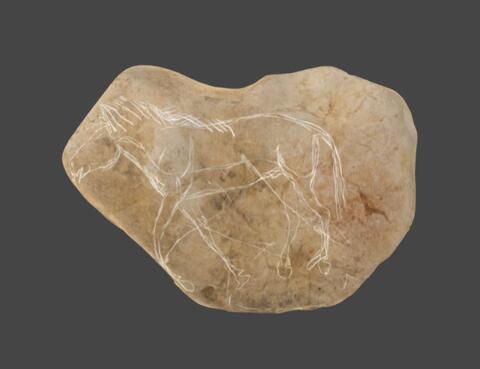 Long d’une trentaine de centimètres pour un poids de 3 kg, le bloc de calcaire dur possède des arêtes arrondies et deux faces très lisses : il s’agit donc au sens strict d’un galet, même si, dans le langage courant, un galet désigne généralement une pierre plus petite et plus légère. Recto : un cheval est suivi d’un être imaginaire qui combine des attributs humains et animaux. La zone rougie près du bord gauche est due à l’exposition à la chaleur du foyer. Verso : sur cette face couverte de minuscules concrétions, les gravures sont plus fines et plus denses. On distingue un cheval et deux rennes de facture plus sommaire, disposés tête-bêche.