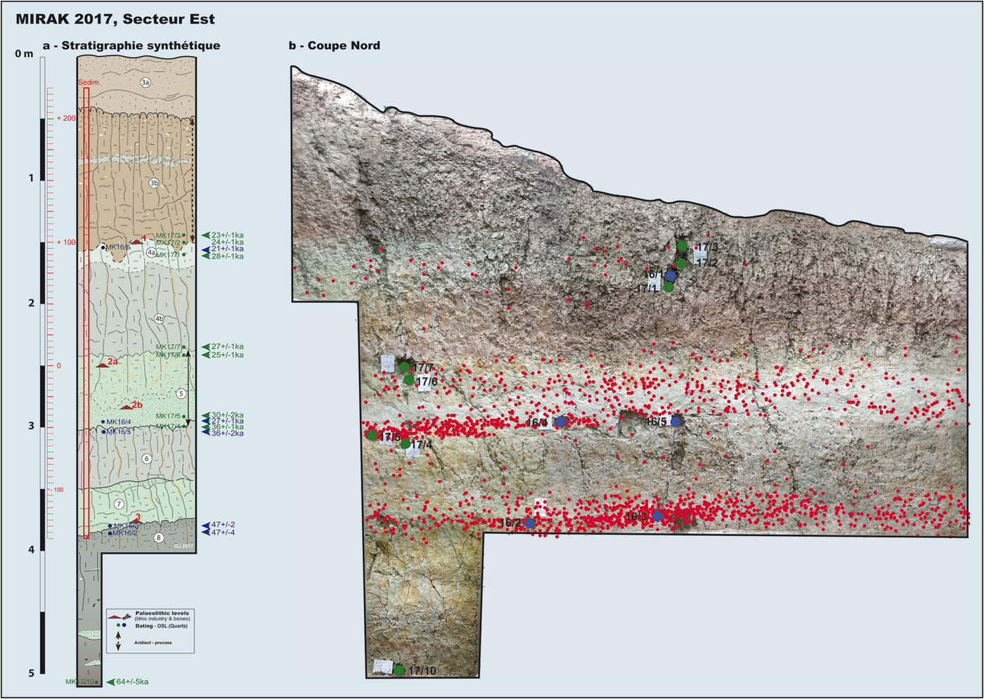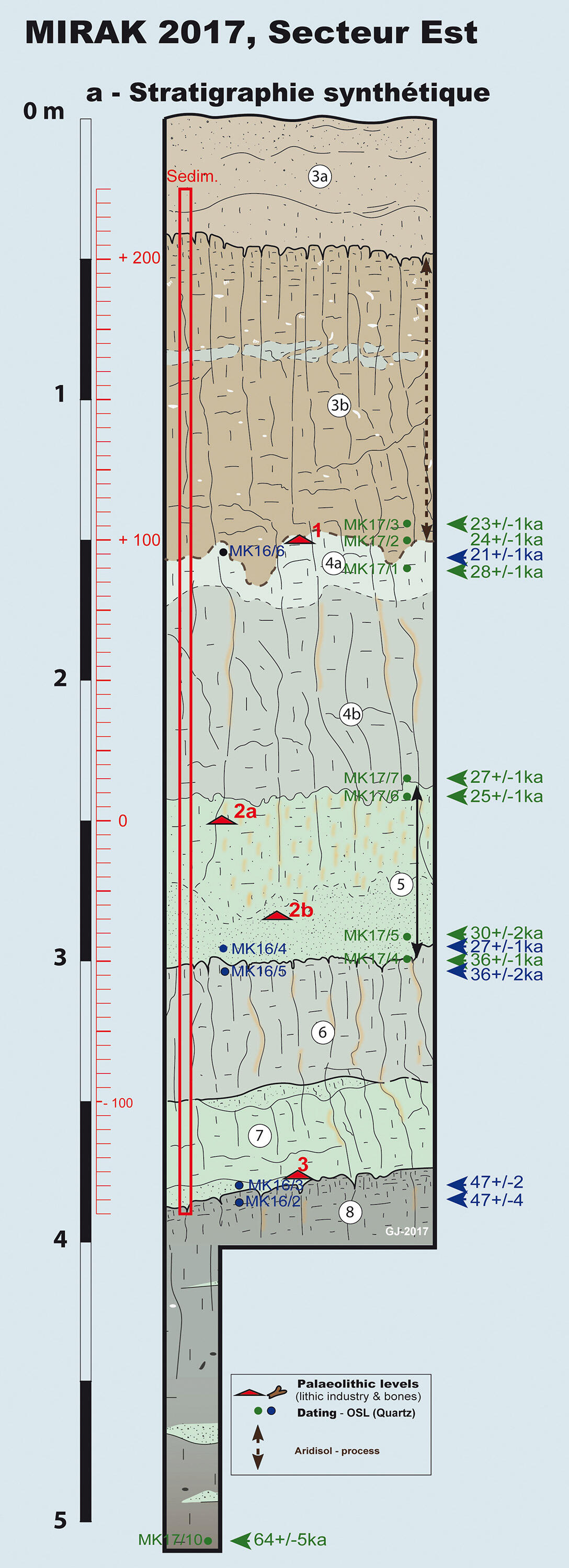 Les vestiges lithiques situés en surface se concentrent en périphérie de buttes de 6 à 10 mètres de haut environ, en particulier la butte n° 8. En fouillant Mirak 8 et en menant ses travaux de terrain de 2015 à 2018, le FIPP a permis de faire le lien entre ces artefacts de surface initialement attribués au Paléolithique moyen et les vestiges d’au moins trois périodes d’occupation humaine en contexte stratigraphique, d’en préciser la chronologie et l’environnement de dépôt. Préservées sous une paléodune formée à l’Holocène (la butte), ces occupations datées de 50 000 à 25 000 ans environ, sont la preuve de la présence de Néandertaliens puis d’Humains modernes dans le Nord du Plateau Central Iranien alors que l’environnement, aujourd’hui désertique, y était tempéré et humide.