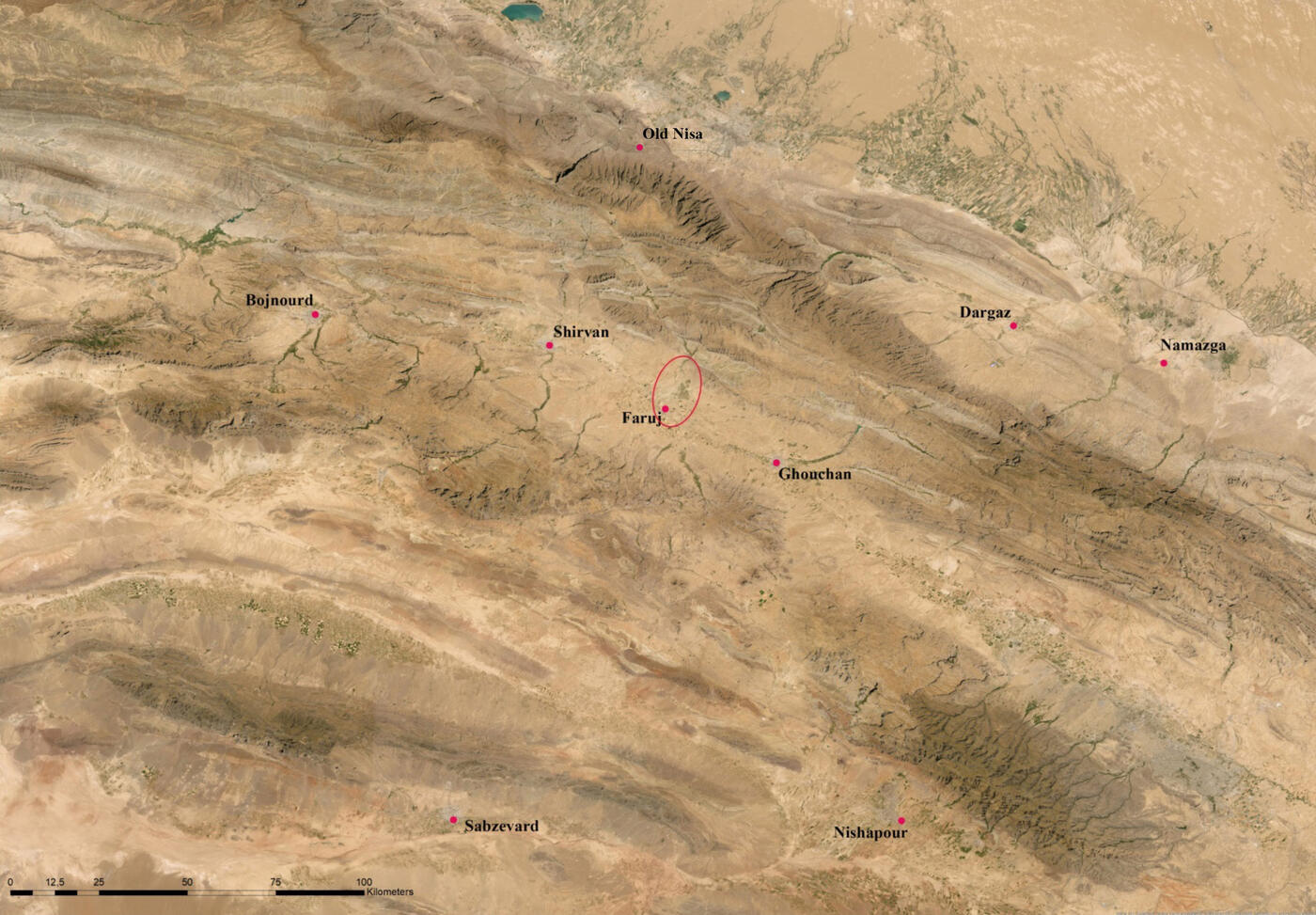 Les fouilles archéologiques récentes, après avoir investigué le site de Robat-e Sefid et sa région, se sont concentrées sur le site de Viranshahr, au nord du village de Farouj, sur le piémont sud du Kopet Dagh, à une altitude d’environ 1220 m. À l’instar de Nishapour, ou d’autres villes d’Asie centrale, Viranshahr a une forme quadrangulaire, presque carrée, typologie de ville certes assez répandue à l’époque sassanide (Sauer 2013), mais qui dans notre contexte a été datée par 14C de l’époque parthe (Ier siècle apr. J.-C.). Le site couvre une surface d’environ 14 hectares. Il est constitué d’une citadelle quadrangulaire d’environ 1 hectare et d’un shahrestan, lui aussi quadrangulaire, mesurant environ 13 hectares.