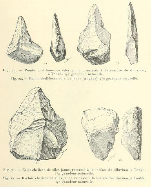 Cette planche issue de La préhistoire de l’Égypte présente des outils lithiques provenant des stations paléolithiques de Toukh et d’Abydos. Il les rapproche, par leurs caractéristiques, de l’industrie chelléenne européenne alors bien mieux connue que l’industrie lithique égyptienne. Il conclut ainsi “Les documents que nous possédons aujourd’hui sur l’homme quaternaire en Égypte [...] suffisent à en prouver l’existence mais montrent que les recherches en ce sens ne sont qu’ébauchées et que l’avenir réserve bien des découvertes.”