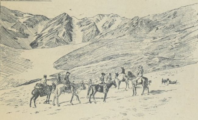 Cette gravure montre une ascension à environ 5000 mètres d’altitude du Zerd-e-Kouh au pays des Batkyaris durant le voyage de 1898.