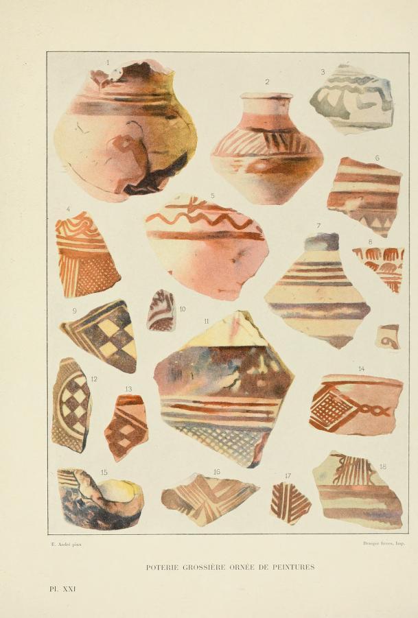 Cette planche figure des tessons du deuxième style céramique identifié par Jacques de Morgan, qu’il qualifie ici de “poterie grossière ornée de peinture”. Ce type céramique se rencontre à partir de la période Suse IVa entre 2600-2400 av. J.-C.