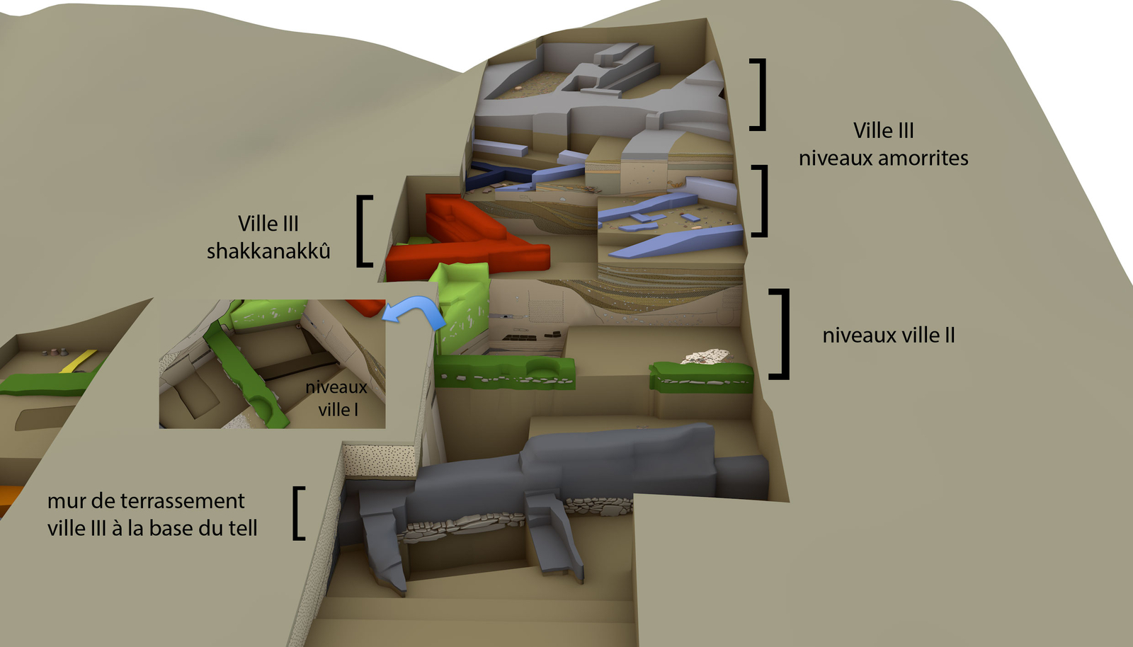 توضع متراكم للمدن الثلاث القديمة في ماري. نموذج رقمي للحفرية، تنقيبات ٢٠٠٧-٢٠١٠ تحت إدارة . ب. بيترلان. مسؤول الحفرية : و. أبو عزيزة.