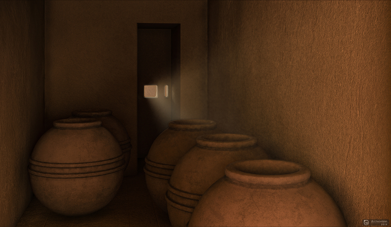 Cet espace central du secteur de l'administration P était fortement éclairé par le lanterneau, dépassant la hauteur des toits en terrasse tout autour : les taches lumineuses qui se projettent sur le mur proviennent des fenêtres opposées (sans en reproduire la forme entière à cause de l'inclinaison des rayons du soleil). Les fenêtres intérieures ont été restituées pour éclairer, en second jour, les pièces périphériques de l'étage.