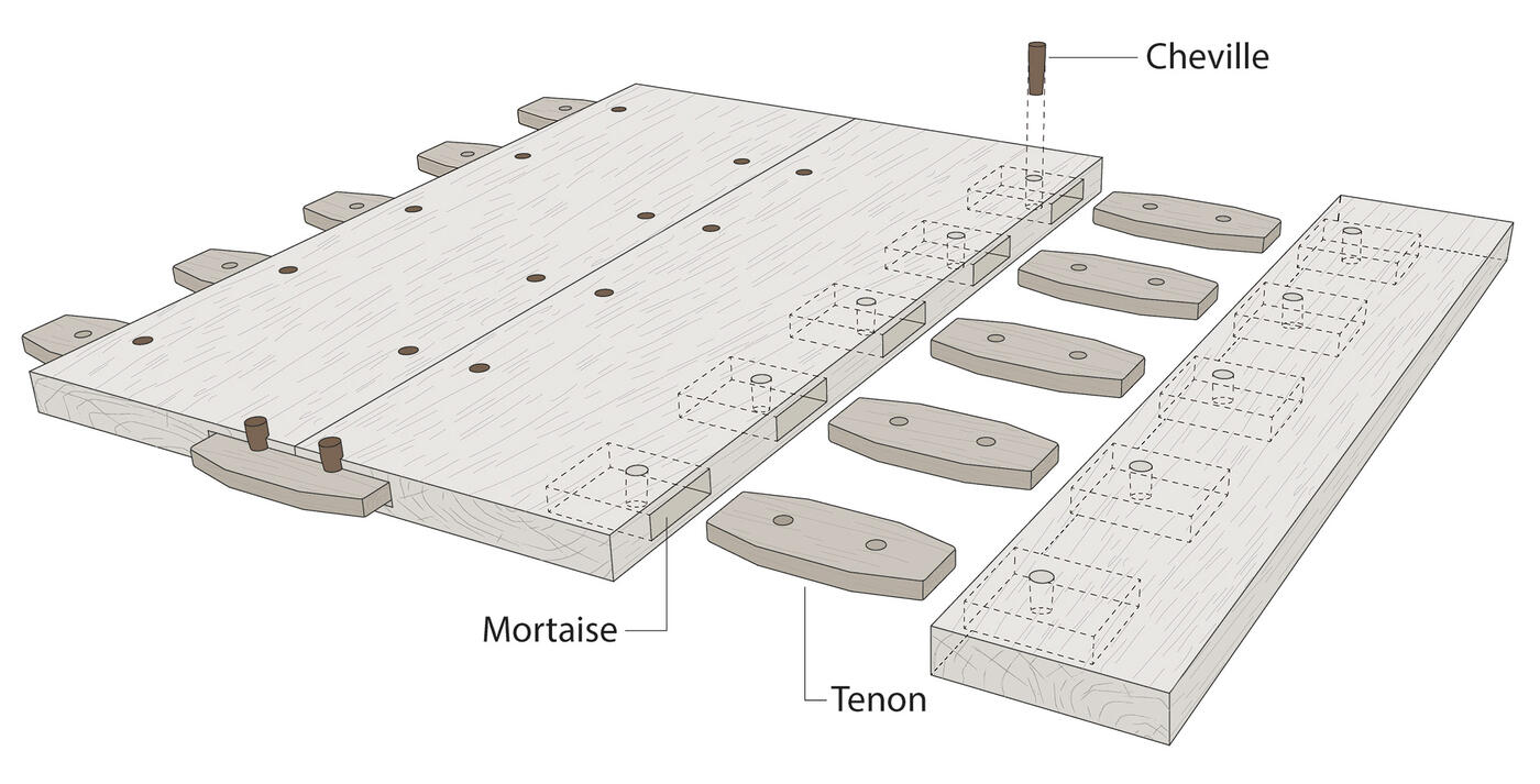 La quille et le bordé sont assemblés entre eux par de nombreuses languettes en bois (tenons) insérées dans des encoches (mortaises) creusées dans l'épaisseur des planches. Les tenons sont bloqués dans les mortaises à l'aide de petites chevilles. Ces joints non seulement forment un réseau très dense qui assure la cohésion du bordé avant la mise en œuvre des membrures, mais confèrent à la coque une grande résistance.