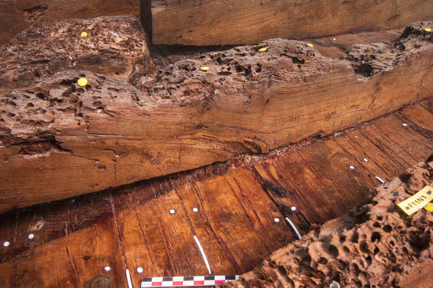 Malgré l’état de conservation assez médiocre des bois, la fouille a révélé d’autres détails révélateurs de procédés de construction « sur bordé premier ». Une fois le bordé achevé, les charpentiers ont gravé à la pointe sèche (avec un outil métallique pointu) sur la face intérieure des planches des traits parallèles, créant ainsi des repères servant à positionner les membrures au bon endroit. Ils ont également inscrit au charbon de bois des traits verticaux sur les flancs des membrures avant leur assemblage au bordé. L’espacement entre ces traits correspond à la largeur des planches. L’observation de ces marques est donc très importante afin d’étudier le processus de mise en œuvre des divers éléments composant la structure du navire.