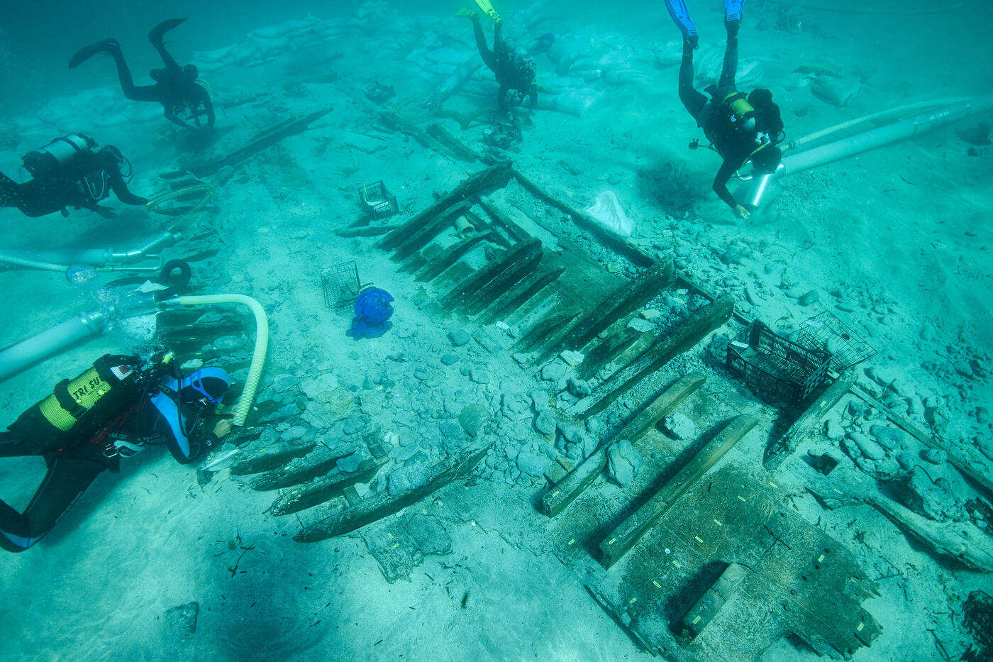 Vue de la zone de proue ; au premier plan, l’amas de bois et des d’amphores ; à l’arrière-plan, est visible la quille. © CNRS, CCJ/Loïc Damelet.