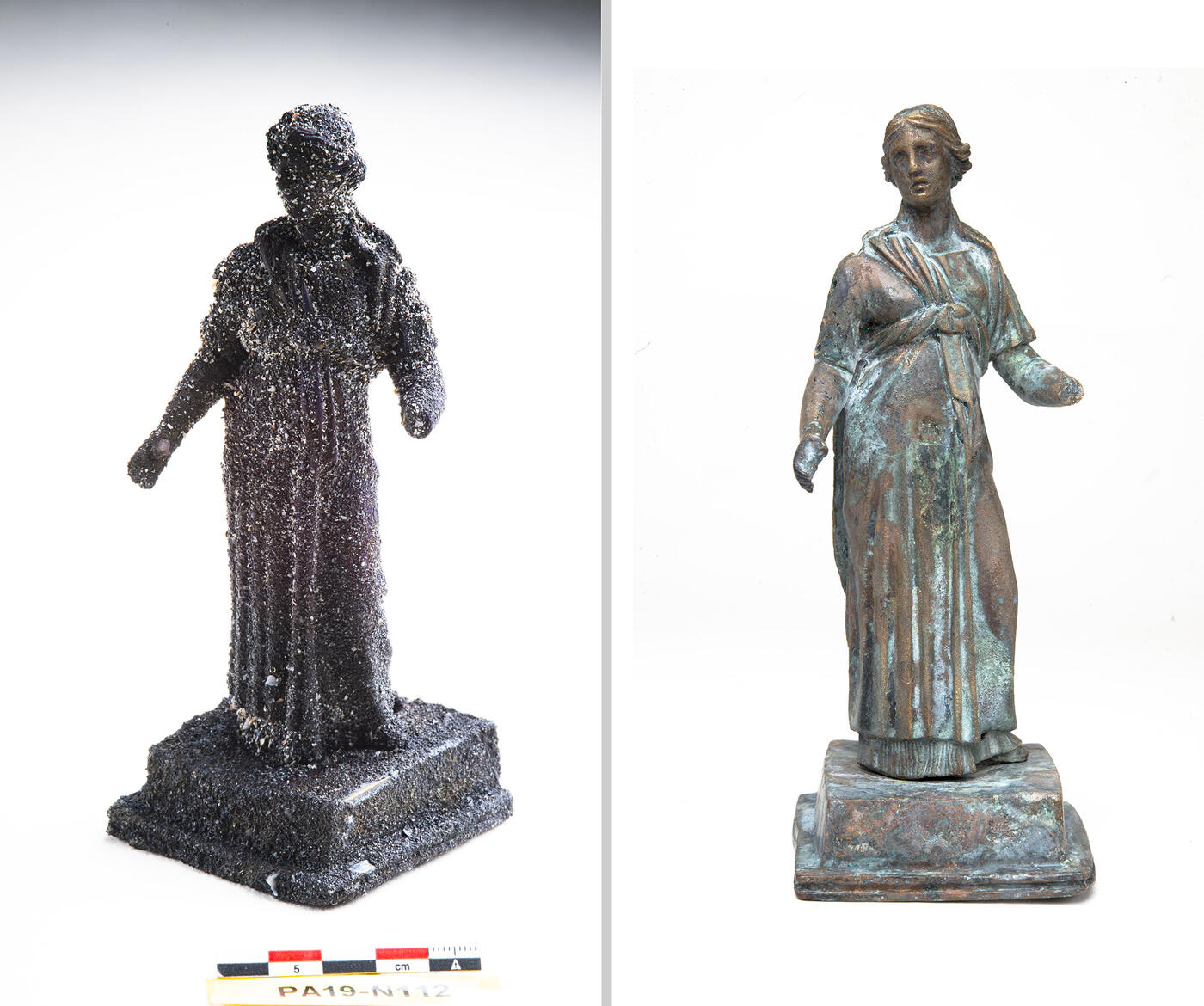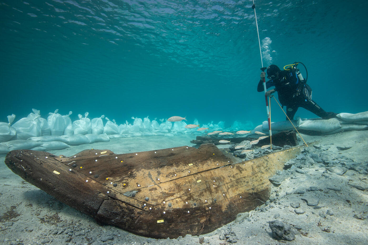 La zone de proue a restitué une statuette féminine en bronze qui était fixée aux structures du navire et qui représente un rare témoignage des cultes pratiqués à bord. D’autres objets – une petite lampe, de la vaisselle, une meule portative en pierre utilisée pour moudre le grain et des outils de charpentier – se réfèrent à l’équipement des marins. Par ailleurs, les quelques branches carbonisées qui ont pu être identifiées, représentent ce qui reste du foyer de bord où étaient cuits les aliments.