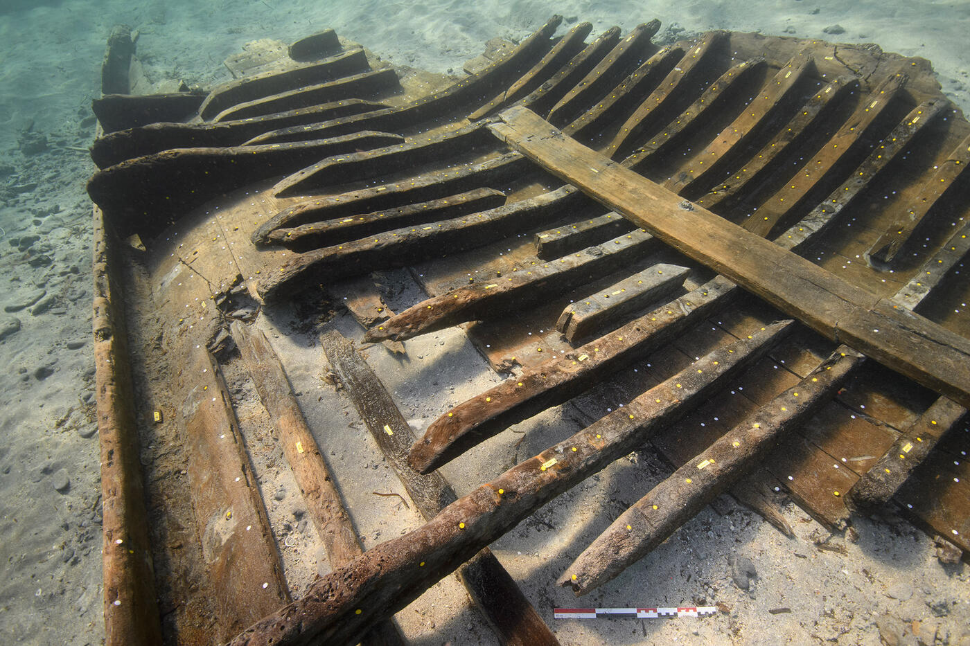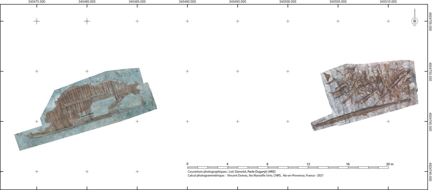 L’épave est formée de deux ensembles qui ont été trouvés à environ une vingtaine de mètres de distance. À proximité de la quille et des vestiges de l’extrémité avant du navire (proue), la fouille a mis au jour un amoncèlement enchevêtré de grumes de bois, parfois longs de plus de quatre mètres, dont la plupart conservaient l’écorce et présentaient des signes d’abattage et d’élagage des branches.