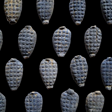 Il faut cependant souligner la présence d’un groupe comprenant des perles-boutons en forme de dôme et à décor de rosace, parmi lesquelles des pièces caractérisées par un corps blanc ou blanc grisâtre (et non bleu-gris comme la glaçure). Pour ce groupe, on peut envisager l’hypothèse d’une production égyptienne avec une recette différente (avec peut-être l’emploi de fondants différents, suggéré par des teneurs différentes en aluminium, sodium et potassium) ou celle d’une production locale « égyptisante », utilisant néanmoins des matières premières (cobalt) égyptiennes.
