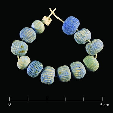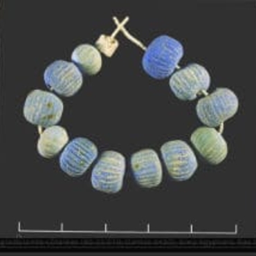 Le bleu égyptien est bien représenté à Ougarit. Un corpus d’environ 250 objets datés du Bronze récent a été identifié, auquel viennent s’ajouter des pains de matière brute. Environ 1/5e de ce corpus a été étudié au Centre de Rechercher et de Restauration des Musées de France [microscopie optique, diffractométrie des rayons X, analyses par faisceaux d’ions (PIXE)]. Les analyses ont porté sur les différentes catégories typologiques : perles, scarabées et scaraboïdes, sceaux-cylindres, pions de jeu, fragments de disques, vases et blocs de matière. Différentes nuances de bleu (de très clair à foncé) ont été reconnues.