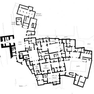 Le rez-de-chaussée, seul conservé, comporte près d’une centaine d’espaces, parmi lesquels des lieux de réception, des pièces d’apparat liées au protocole royal, des espaces destinés au culte, et aussi des lieux de détente tels celui agrémenté d’un grand bassin ou encore le grand jardin. Le palais était aussi un centre de stockage ; on y entreposait les biens de consommation destinés à la famille royale, mais aussi des matières premières et des produits contrôlés par l’État, en vue d’être utilisés sur place ou redistribués. Enfin, une partie de l’aile nord était réservée à la nécropole royale.