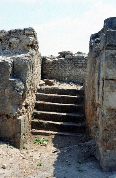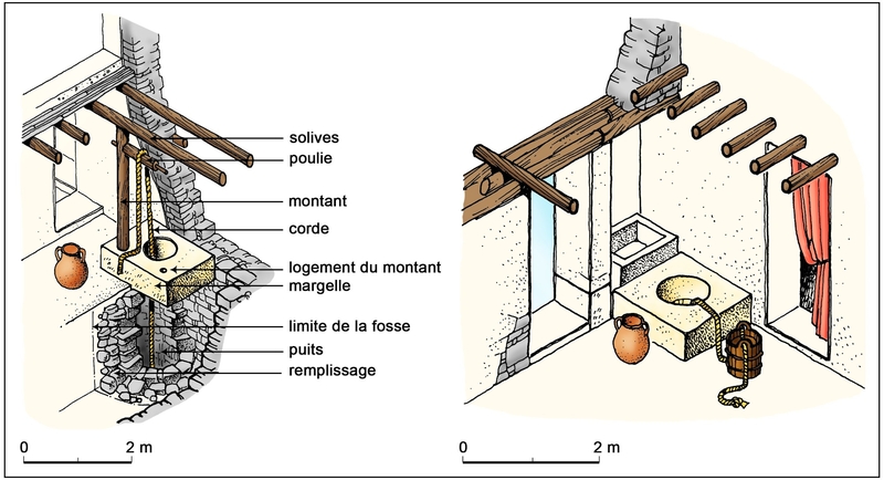 Dans la plupart des maisons fouillées, les vestiges d’un escalier ont donc été retrouvés. Comme pour les murs, la pierre et le bois sont utilisés pour leur construction. Plusieurs types sont connus : à une volée, à deux volées parallèles ou encore à trois volées. Ces escaliers sont aménagés dans des cages, presque toujours situées dans le vestibule d’entrée de la demeure.