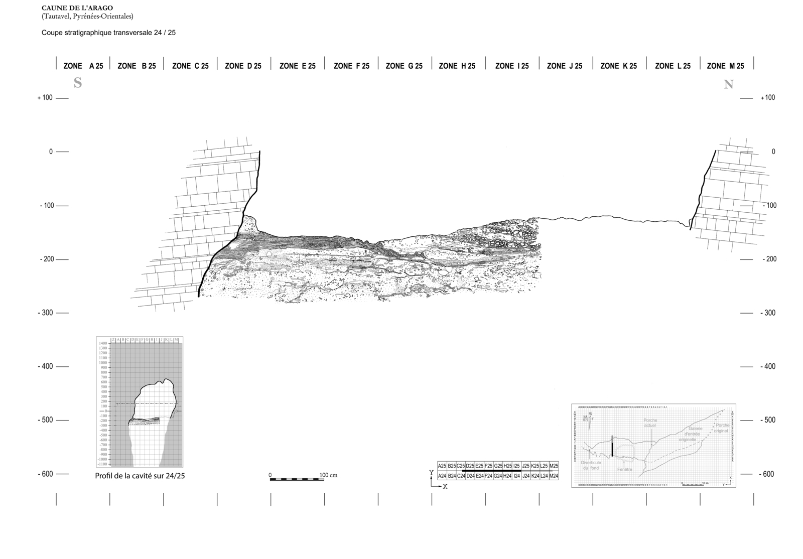 Coupe stratigraphique transversale entre les bandes 24 et 25 de la Caune de l'Arago