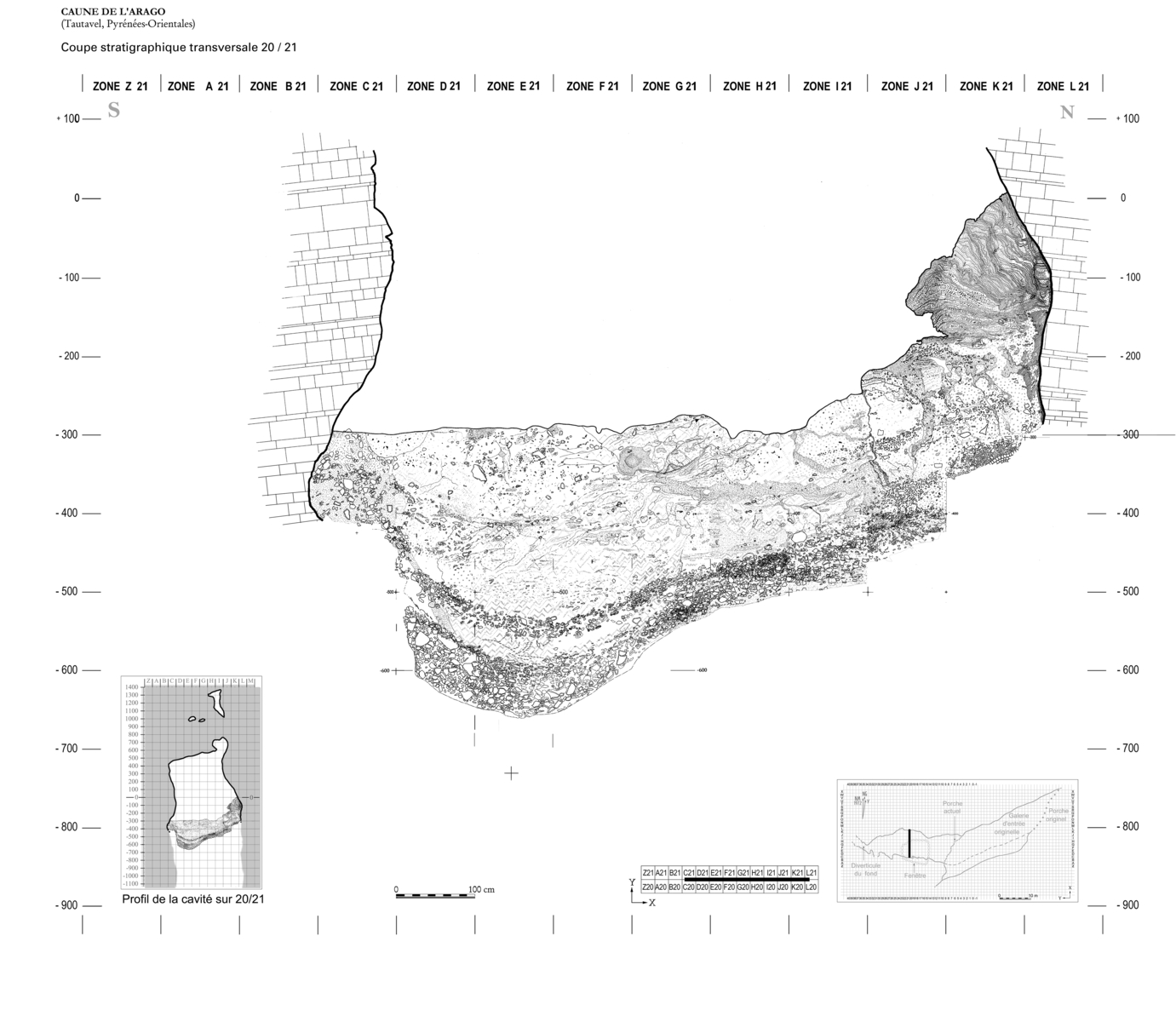 Coupe stratigraphique transversale entre les bandes 20 et 21 de la Caune de l'Arago