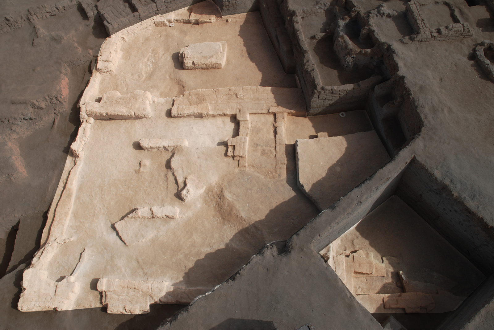 صورة للمبنى الكبير من جهة الغرب (مسلط عليها الضوء في الوسط) التقطت عبر الرافعة عام ٢٠٠٩.