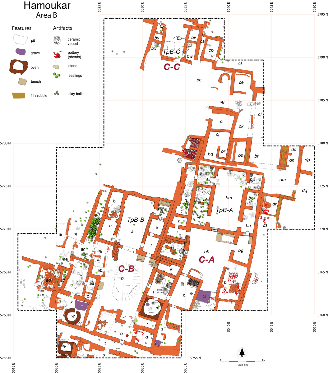 Plan de l’aire B de Hamoukar (LC3-4). Il n’y a pas de différence entre l’habitat d’un petit site comme Feres et celui des premiers sites urbains, comme Tell Hamoukar avec des complexes très similaires.