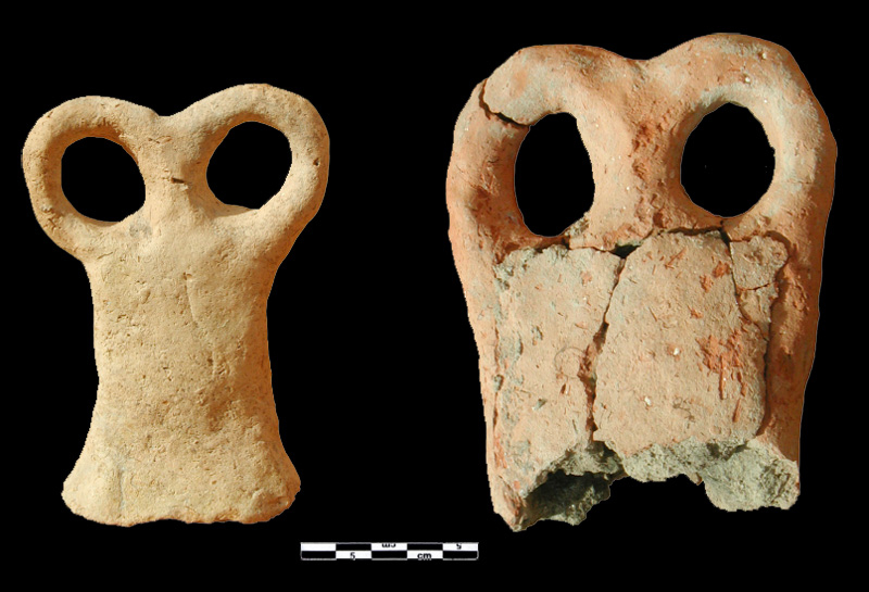 Deux « idoles à lunettes » ou « idoles aux yeux » retrouvées à Tell Feres. Celle de droite est la plus ancienne connue à ce jour, retrouvée dans un grenier, datant du LC1, vers 4300 avant J.-C. Elles sont probablement des amulettes ou symboles dont la signification précise reste inconnue.