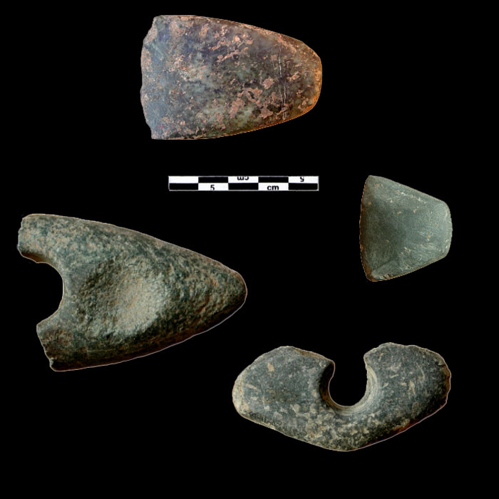 Le site de Tell Feres a livré de nombreux outils en pierre comme des haches (en haut), ciseau à bois (à droite), marteaux naviformes (en bas).