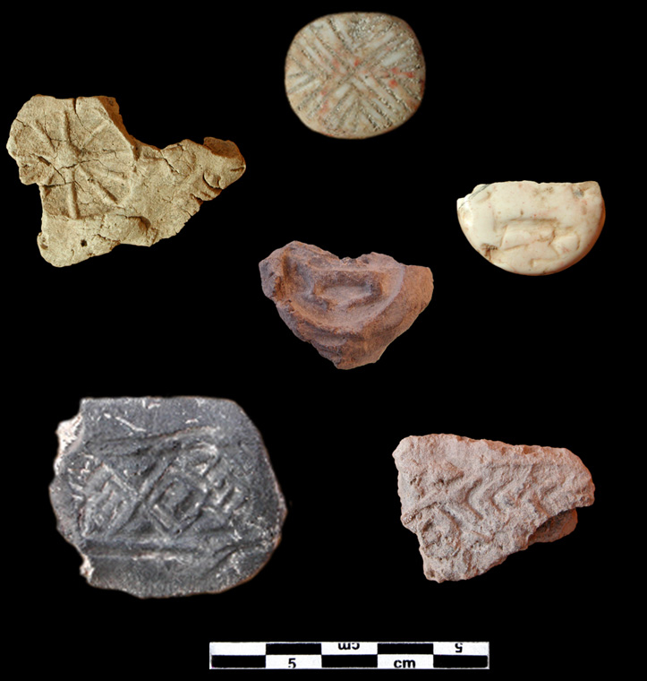 Deux cachets hémisphériques en pierre (en haut à gauche) et des scellements portant un décor géométrique (LC2) et un motif de capriné, au centre (LC3).