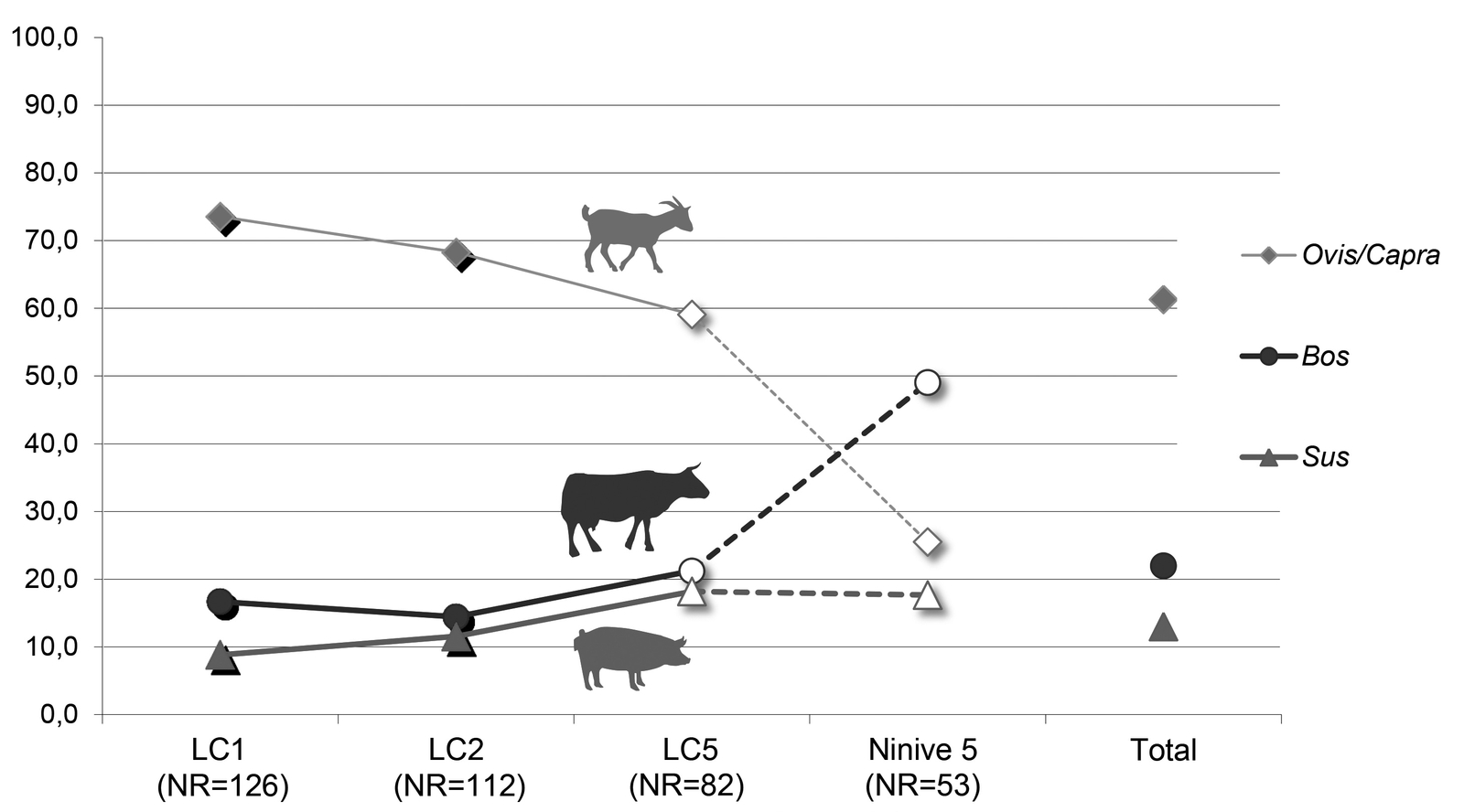 L’exploitation des cochons et des bovins semble augmenter au cours du IVe millénaire au dépend de l’élevage des ovins/caprins largement dominant initialement (LC1). Les pictogrammes blancs indiquent un nombre de reste (NR) inférieurs à 100.